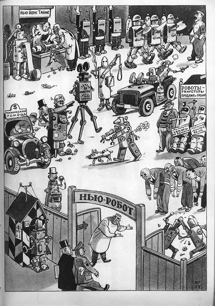 1952年苏联当时流形的科技杂志Tekhnika–Molodezhi上刊登的一副漫画,讽刺控制论的反乌托邦。丨图源:Iulii Ganf & N. Smolianinov