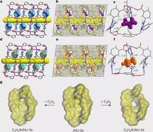 该材料拥有三维网格结构,沿着晶体a轴有4.5 × 5.3埃(长度单位,1埃相当0.1纳米)的一维通道,在一维通道两侧是排列整齐的“分子口袋”,分子口袋和一维通道通过一个约3.7埃的动态“葫芦形”窗口相连。气体可以在一维通道中快速扩散,而分子口袋则通过“葫芦形”窗口选择性地捕获丙烯分子,从而达到分离丙烯/丙烷的效果。
