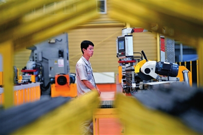 在位于银川经开区的力成电气智能化生产车间内,工人在电脑前监控机器人工作(8月5日摄)。