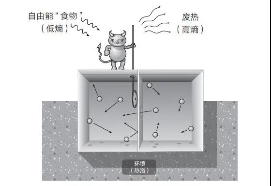 图2:作为生命范例的麦克斯韦妖。小妖精在盒子里维持秩序——温度的分离,通过将自由能转化为高熵热量的信息处理过程来对抗环境的影响。(图中文字:自由能“食物”(低熵);废热(高熵);环境(热浴))