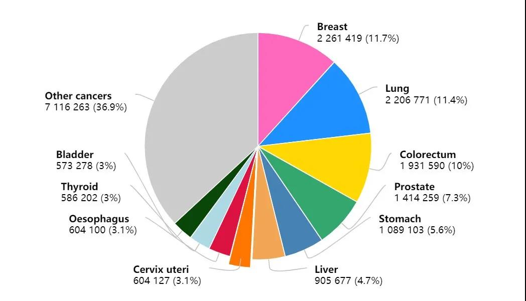 这项最新预估数据显示,2020年全球乳腺癌新发病例高达226万例,超过了肺癌的220万例,乳腺癌取代肺癌,成为全球第一大癌。同时,乳腺癌也是女性死亡人数最多的癌症。