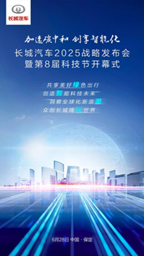6月28日-7月4日,长城汽车第8届科技节将于中国保定隆重举行,长城汽车将以“2025战略发布会”作为科技节开幕式,对外分享长城汽车关于产业变革的新思考,并发布剑指未来的2025战略目标与部署。