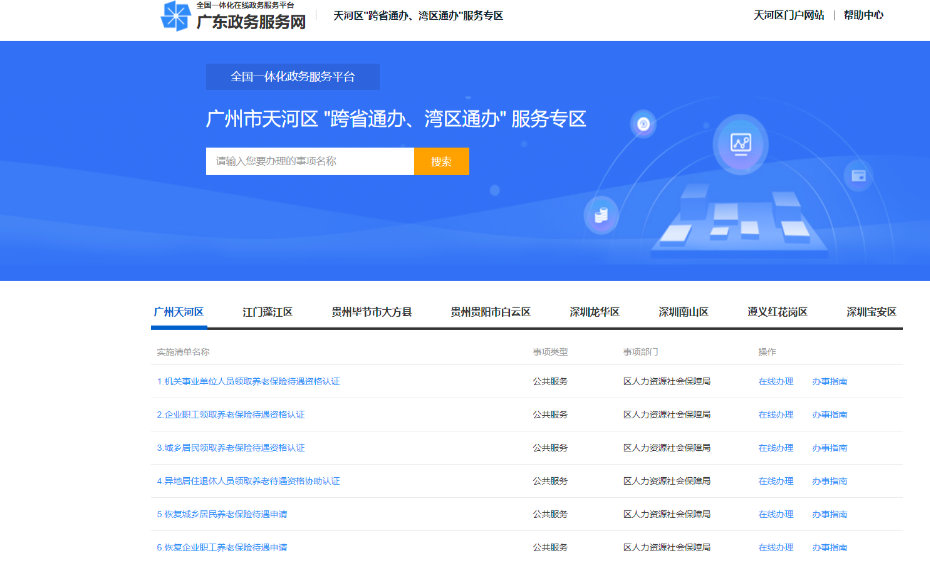 围绕粤港澳大湾区、天河对口协作帮扶地区、来天河务工人员较多的外省地区和发展成熟的政务服务“跨省通办”联盟等四个重点方向,积极对接多地政务服务管理机构,在统一数据共享、身份认证、电子印章、电子证照等方面深度对接,建立天河特色“跨域通办”合作圈。