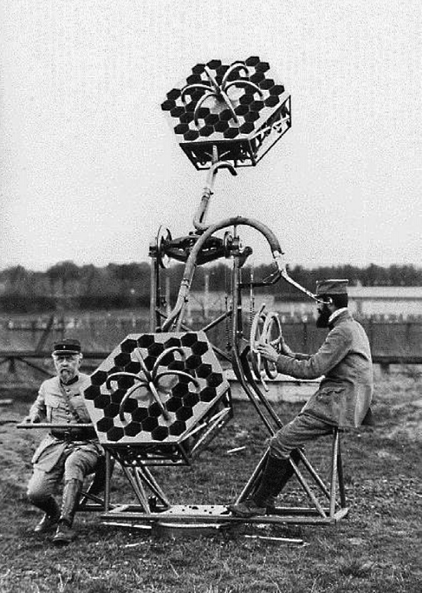 在 Baillaud 的回忆录中,一系列的照片展示了声学抛物面经过大约一年的密集实验的发展。我们发现了尺寸越来越大的仪器,直径从 60 厘米到 3 米不等,形状各异,而且抛物面看起来不太像凹形盘子,而更像深碗。它们结构不同,其中一个由四个抛物面堆叠成两排,因此原本在最大焦点处聆听的一名操作人员变成了两名,两人分别坐在仪器的两端,并用手轮转动仪器。
