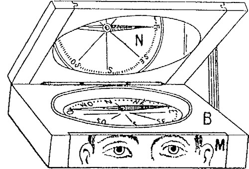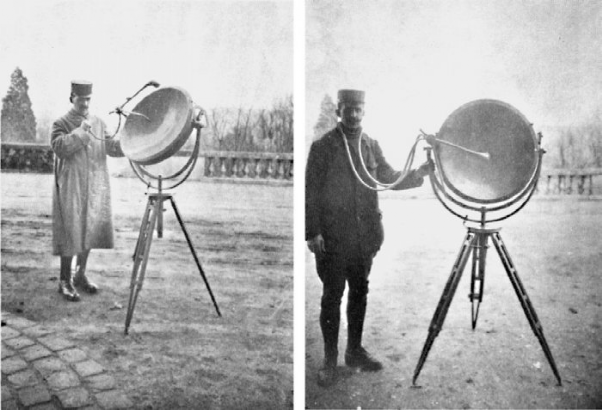1916 年,法国陆军的一名中尉设计了一种 viseur acoustic (“声学面罩”),这是一种由镜子和指南针组成的手持设备。士兵使用这种仪器,将自己的脸对准镜子的中心,这样他就能同样清楚地看到自己的耳朵。指南针大概就能给出声音的方向。