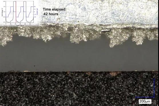 浅灰色晶体结构是在锂电极内部形成的枝晶