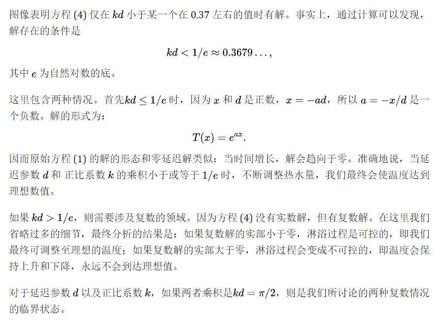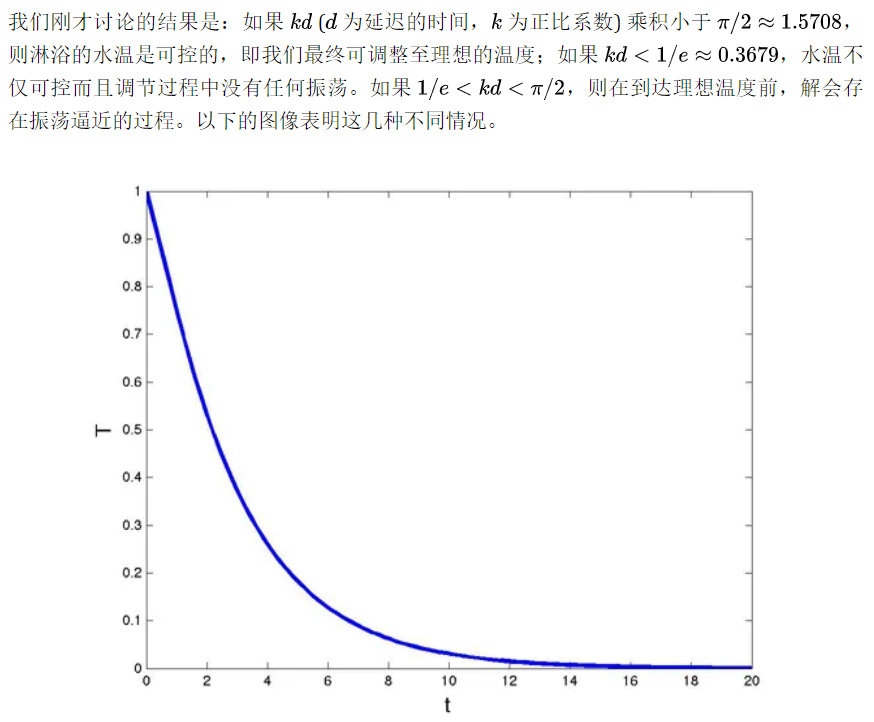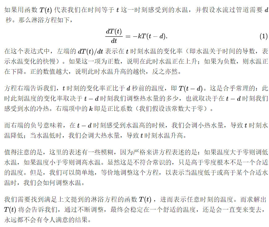 你一定经历过洗澡时水温过热或过冷时的情况,结果调节过量又导致水太烫或太凉了。其实有一个数学方程可以描述这种现象,我们也可以形象地称它为“淋浴方程”,而其中的关键就是延迟——因为水从水管流出需要时间。方程求得的结果是真正能调出最佳温度,还是就只能凑合洗洗?生活中,涉及到延迟的现象太多了,那么淋浴方程又能用在何处?