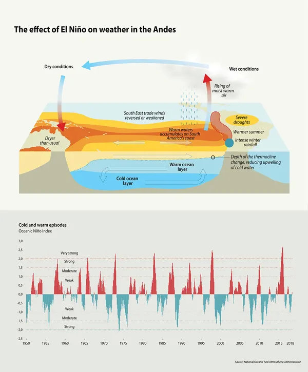 另一个例子是关于厄尔尼诺-南方涛动(ENSO):厄尔尼诺现象是热带太平洋地区温度的一种不规则变化,洋流和大气之间相互作用引起海洋温度升高,每次升温事件之间大约间隔4年。这一现象对太平洋地区,乃至是全世界的经济发展都有重大影响。如果我们可以更好地预测它,那么这将有助于太平洋地区的人们做好准备。