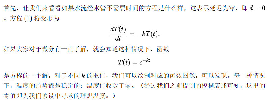 (1)这类方程也被称为微分方程,因为方程里涉及一个变化率的量,即导数。尽管这个方程很不容易求解,但我们至少可以探索解的大致形态——当然,要涉及一点微积分的知识。如果大家觉得有些烧脑,不妨跳至文章最后,可以看看淋浴方程的重要应用。