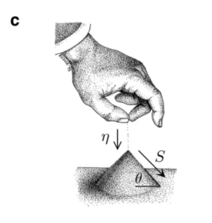 夏日孩子们在沙滩上玩耍,常常堆出越来越大的沙丘。当沙丘堆积时,沙丘斜坡角度会达到一个临界点,一旦到达这个临界点,继续堆积沙子会导致沙丘以雪崩的形式向下滑落。在滑落前的最高点,沙堆处于有序与失稳之间的临界状态。