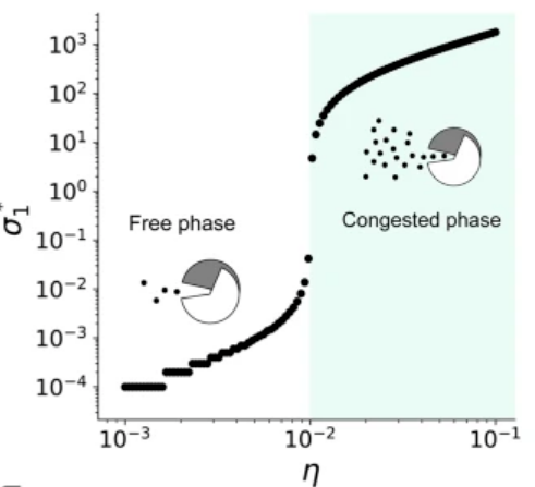 基因表达率η(横轴变量)较高时,细菌会产生过多的蛋白质,处于拥挤状态(下图中浅绿色的部分),而如果基因表达率较低,则细菌处于自由状态。通过调整基因表达率η,可确定划分临界状态与拥挤状态的临界表达率ηc,此时细菌处于自组织临界态,在该位置,任何一点小的变化都会对环境中蛋白质σ的浓度有显著影响。