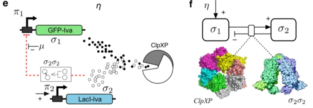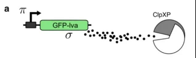 该研究中的大肠杆菌包含GFP-lva基因,该基因会被表达为蛋白σ,而蛋白σ又会被细胞内的蛋白水解机制(ClpXP)降解,从而影响GFP-lva基因表达量。其调控机制如下图所示: