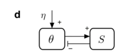 在沙堆模型中,通过向沙堆以速率η添加沙砾,沙堆倾角θ变大,刚开始只有少量沙粒落下,但随着倾角θ接近临界角θc,沙粒数量S迅速增加,直至θ=θc时,再加入的沙子会造成雪崩式的崩塌,造成沙墩倾角θ变小,重新回到临界态,下图描述了其反馈回路。