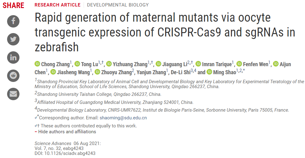 2021年8月6日,山东大学邵明团队在Science Advances 在线发表题为“Rapid generation of maternal mutants via oocyte transgenic expression of CRISPR-Cas9 and sgRNAs in zebrafish”的研究论文,该研究提供了一种转基因方法来灭活斑马鱼原代卵母细胞中的母体基因。通过将三个串联单向导 RNA (sgRNA) 表达盒和绿色荧光蛋白 (GFP) 报告基因引入Tg(zpc:zcas9) 胚胎,有效地在 GFP 阳性 F1 后代中获得了母体 nanog 和 ctnnb2 突变体。
