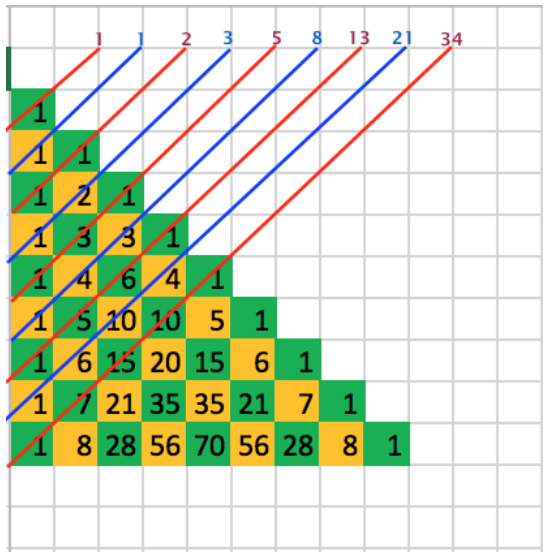 例3. 帕斯卡三角中隐藏着斐波那契数列。将帕斯卡三角排成图3的样子,将斜率为1的线所划过的数字相加,即得到斐波那契数列 1, 1, 2, 3, 5, 8, 13, 21…..。