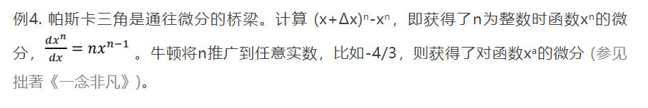 帕斯卡三角得自二项式(a+b)^n的展开。应该容易得到,在古代中国、印度和阿拉伯的数学里都有。帕斯卡的“算术三角”一文写于1654年,可以推测他做出此发现应该是在更早的某个时期。在这篇文章中,帕斯卡引入了著名的数学归纳法(the principle of mathematical induction),这是一个让笔者非常痴迷的证明方法。1654年,帕斯卡做了一个神奇的梦,从此转而更多地投入宗教活动,减少了在数学研究方面的精力投入。
