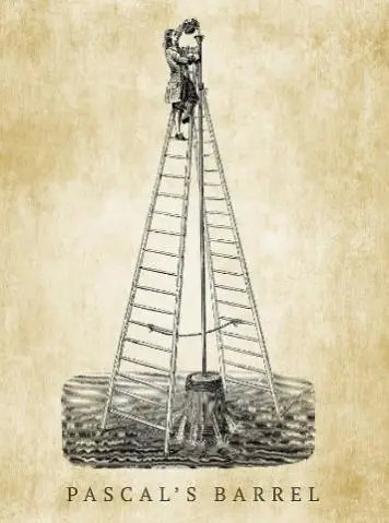 帕斯卡的物理学成就集中在对流体静力学和动力学方面的研究。他的研究对物理学的影响是如此之巨,以至于压强的单位定为帕斯卡,符号为Pa。在帕斯卡的时代,流体研究涉及的对象大致就是空气、水和水银(水银对物理学的发展太重要的了,气压的测定、超导的发现)。关于流体静压力问题,帕斯卡认识到,开放容器中的静止液体,其在液体中所产生的压强只和距离液面的高度差有关,而与液体容器的形状无关。为了证明这个思想,传说有帕斯卡水桶实验:将水桶上面密接一个细的管子,从管子顶端注水,可以看到当水面高到一定程度时,水桶被压漏了(图4)。在细的管子中注水用不了多少水,所以桶被压漏了不是简单地由水的重量引起的。进一步地,帕斯卡于1653年得出了关于液体压强的帕斯卡定律,也叫液压传递原理(the principle of transmission of fluid-pressure),用今天的话说,即不可压缩液体局域压强的变换可以传递到各处。基于液压传递原理,人类制造出了液压机,使得大型设备制造成为可能。强调一下,帕斯卡定律是个粗糙的表述,经不起更严格的推敲,但是对于工业应用来说,有现象的发现就够了。