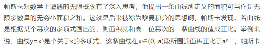 帕斯卡的数学成就皆为开创性的,有概率论、投影几何、积分等,最著名的有得自二项式展开的算术三角,即帕斯卡三角。帕斯卡三角在我国称为杨辉三角,比帕斯卡要早得多,可惜没有后续发展。