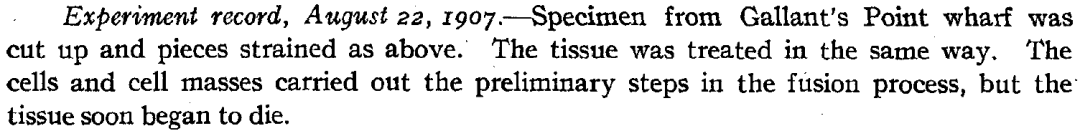 海绵是生活在海洋里的世界上结构最简单的多细胞动物之一,没有头、尾、躯干、四肢的分化,不存在神经或者器官,是十分原始的动物。通过鞭摆动泵入海水获得氧气与养料。虽然最终取得了成功,但威尔逊的研究并非一帆风顺,在研究波弗特港附近常见的一种海绵时,他在实验记录中写到:“将样品切成碎片并按照之前流程操作后,细胞和细胞团正常地进行了融合,但是组织不久便开始死亡。”
