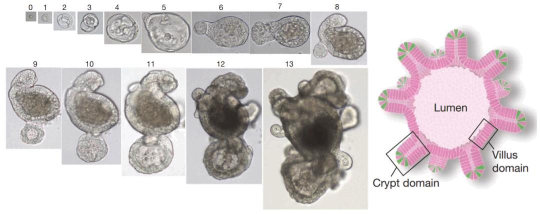 2009年,Hans Clevers实验室使用单个鼠LGR5+肠干细胞在体外自组织成为具有肠隐窝-绒毛结构的肠类器官。