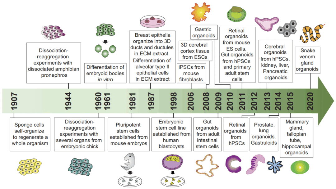 近年来火热的干细胞研究,主要开始于上世纪末。1987年,A. J. Friedenstein发现间充质干细胞 (Mesenchymal Stem Cell, MSC). 1998年,美国生物学家James Thomson首次分离得到人胚胎干细胞。2007年,Thomson教授成功制造出人诱导多能干细胞 (induced Pluripotent Stem Cells, iPSC). 如今,绝大多数类型的非肿瘤来源的人源类器官均可由MSC或iPSC发育而来,干细胞研究的飞速进展为类器官研究带来新的活力。