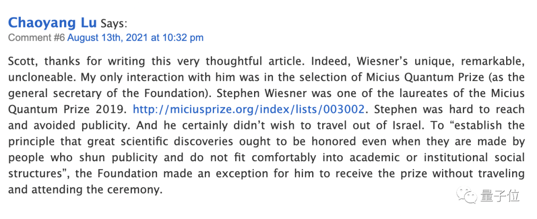 中国物理学家陆朝阳等人也在这些学者的博客里回帖悼念Wiesner。