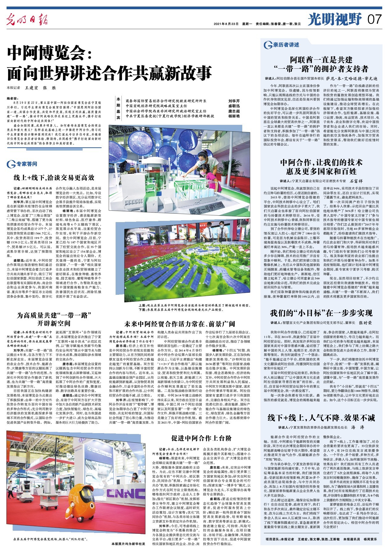 刘华芹:共建“一带一路”倡议提出8年来,在各方努力下不断走深走实。本届博览会设置的农业合作、技术合作、能源合作、大健康等方面的议题拓展了共建“一带一路”合作的范围,为深化中阿经贸合作提供了新机遇,也为共建“一带一路”高质量发展指出了新方向。