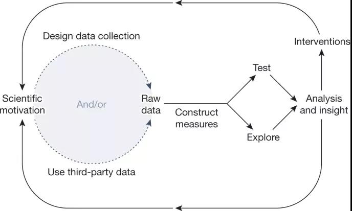 科学动机指导研究人员设计数据收集协议,使用第三方数据或开发出这两者的某种融合。在原始格式中,数据提供了经过处理成度量的观察结果,这些观察结果可以用来测试预先设想的假设(以演绎的方式)或从探索性分析中得出新的假设(以归纳的、数据驱动的方式)。这些演绎和归纳分析旨在提供见解,然后反馈到科学动机中,为政策干预提供信息,或者更广泛地来说,推动基础和应用研究。