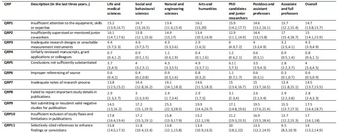 报告给出的11条QRPs以及论文作者不同领域、身份的总体统计情况。|来源:doi:10.31222/#/vk9yt