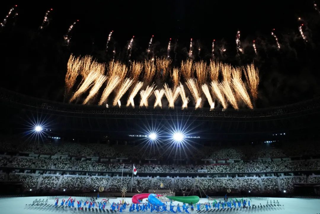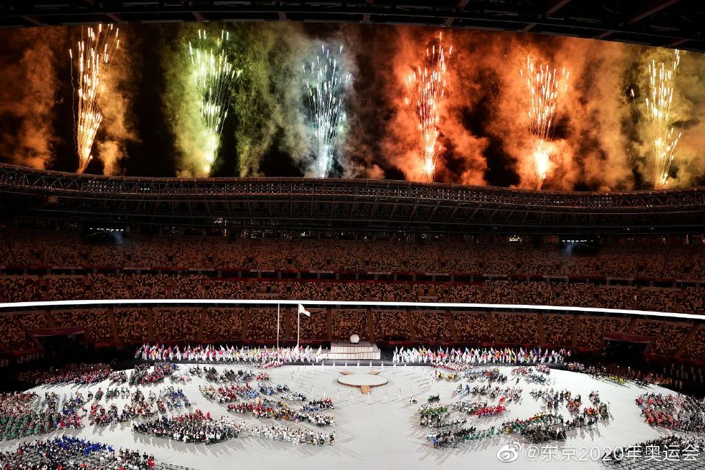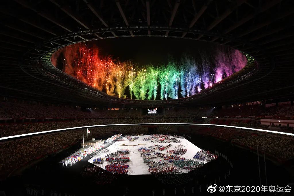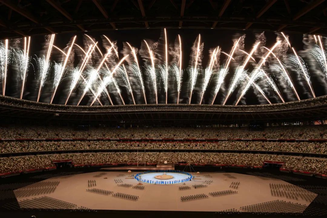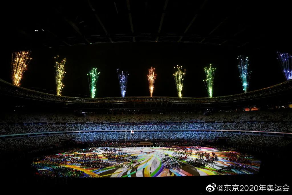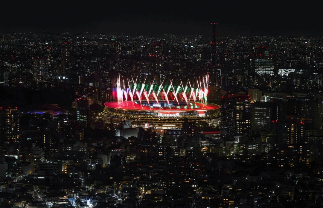 这是在日本东京的涩谷天空展望台拍摄的开幕式焰火表演。新华社记者 杜潇逸 摄
