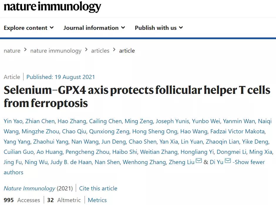 2021年8月19日,昆士兰大学/上海交通大学余迪,华中科技大学刘争及复旦大学张文宏等人在Nature Immunology 在线发表题为“Selenium–GPX4 axis protects follicular helper T cells from ferroptosis”的研究论文,该研究报告了 TFH 细胞显示出强化的脂质过氧化和线粒体形态改变,类似于铁死亡的特征,这是一种由铁依赖性脂质过氧化积累驱动的程序性细胞死亡形式。