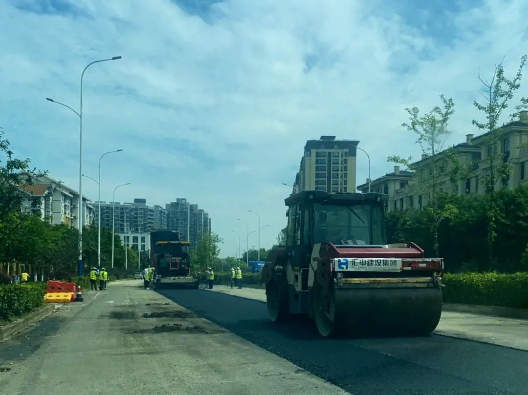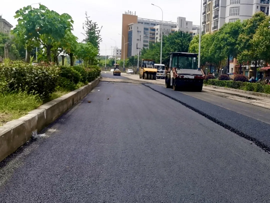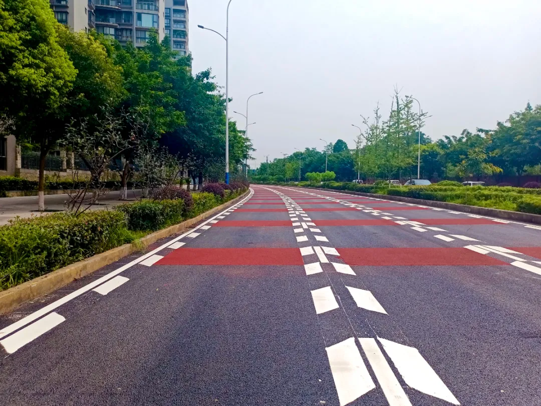 ▲大学城东一路近200米下坡路段铺设彩色抗滑薄层。