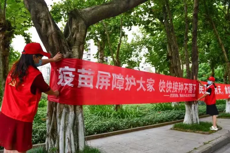 ▲树人思贤小学教师志愿者呼吁小区居民进行疫苗接种。