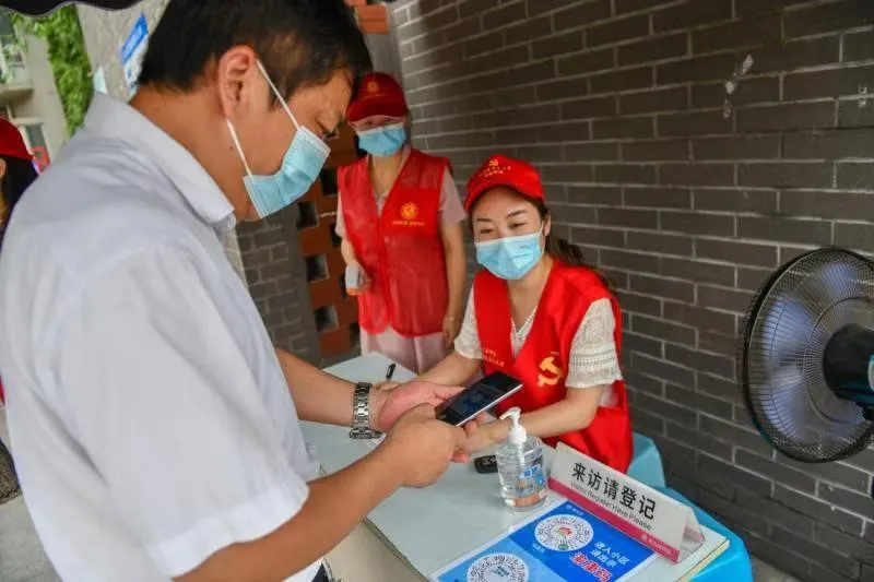 ▲教师志愿者走进物业小区,进行体温检测和来访登记。