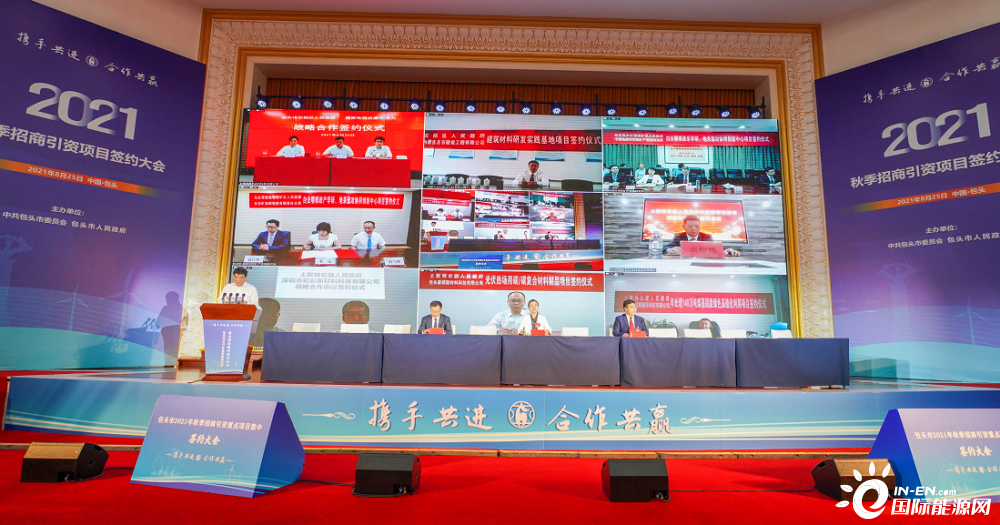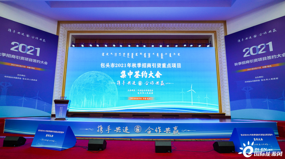 8月25日上午9:30,包头市2021秋季招商引资重点项目集中签约大会顺利召开。大会通过现场签约、网络签约相结合的方式,集中签约45个重点项目、总投资超1160亿元。其中,光伏、氢能、风电、碳中和等绿色低碳能源相关项目22个,总签约金额超893亿元。