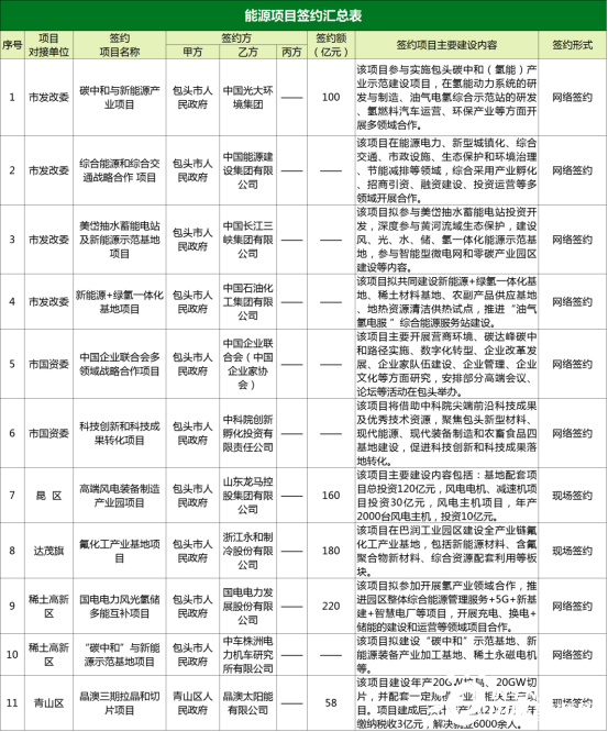 其中,中国能建、三峡集团、中国石化分别就综合能源和综合交通战略合作项目、美岱抽水蓄能电站及新能源示范基地项目和新能源+绿氢一体化基地项目与包头市人民政府签约。