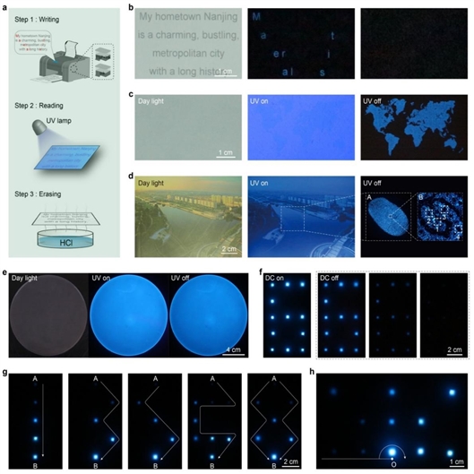 高效蓝色磷光材料的信息加密、指纹识别和余辉显示器件的应用。a,喷墨打印实现加密应用的流程图。b,喷墨打印技术实现信息“材料”的加密。c,复杂图案的清晰打印。d,指纹识别应用。e,均匀的TSP薄膜。f,余辉显示器件的数字显示。g,余辉显示器件的路径显示。h,余辉显示器件模拟雷达应用。黄维等供图