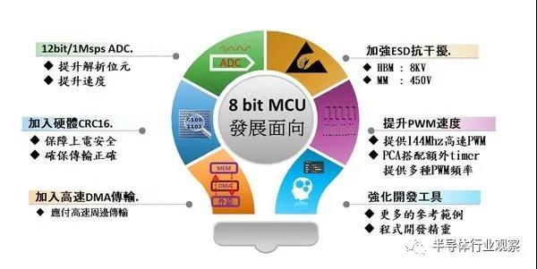 观察8 bit MCU能够在市场上历久不衰,其最大的原因是在某些应用方面有不可取代性。长远来看,32位元MCU持续扩大占有率是不变的趋势,而今8 bit MCU也随着市场应用不断的改革出新。预估接下来的几年,应该还是一个8位元与32位元MCU并存的时代,如同RISC/CISC架构在目前的微算机市场下各据山头。