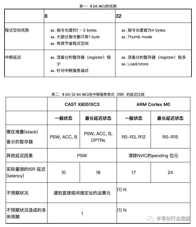 此外,8bit MCU有些架构上的特点,如可较节省程式空间与降低中断延迟,以下表列出8 bit MCU的几项优势,并搭配国外进行的实验,从中比较可看出8 bit MCU 在某些运行效能较32 bit MCU来得更有优势。