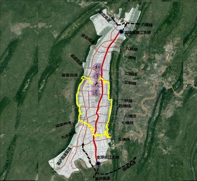 科学大道二期为科学大道重庆高新区段除一期外的剩余部分,包含了中柱立交至龙井湾立交的北段,长6.7公里,及狮子口立交至三百梯立交的南段,长11.4公里。