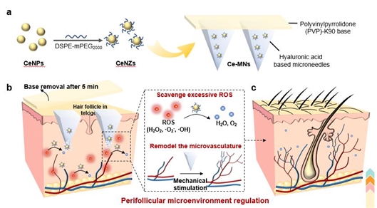 据介绍,研究人员以透明质酸为微针贴片的针体基质,在针体中载入氧化铈纳米酶,通过微针刺穿皮肤角质层,针体溶解后释放其中包载的氧化铈纳米酶,直接将氧化铈纳米酶递送至皮肤深处,以清除毛囊周围过量的活性氧,改善患处的氧化应激微环境。同时,微针的促血管新生作用,还能够重塑毛囊周围的微血管系统,进而调控毛囊的生长周期,诱导毛囊由静止期进入生长期。