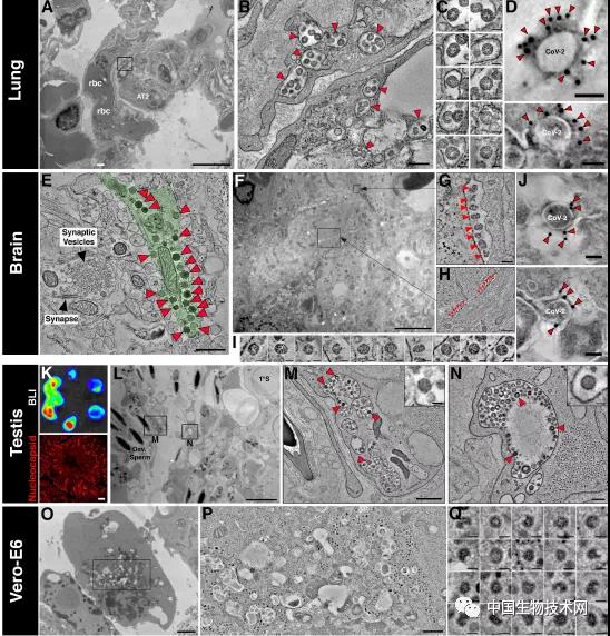 在这项研究中,研究人员利用生物分子荧光标记和电子显微镜,追踪了新冠病毒在单细胞水平上的传播。实时成像显示,在小鼠体内,新冠病毒走的是一条“老路”:它依次从小鼠的鼻腔扩散到肺部,此后扩散到包括大脑在内的全身各个器官,最终导致死亡。这与人感染新冠病毒后在人体中的传播方式相同。