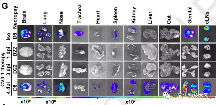 在第6天,小鼠死亡。尸检时拍摄的显微镜图像显示,大脑中的发光信号活动最大,其次是肺部和鼻腔。
