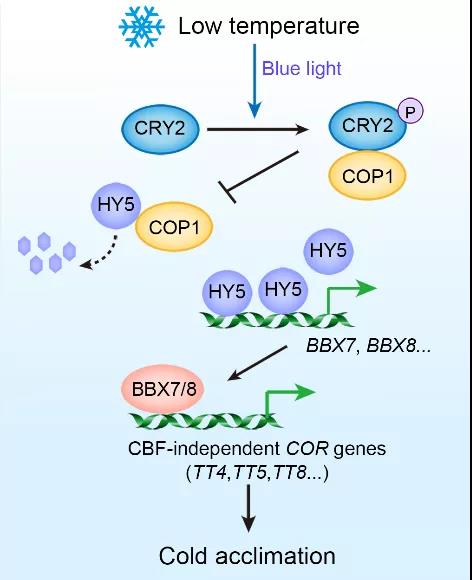 研究者首先探究了自然光中的不同光质(红光和蓝光)对植物冷锻炼的影响,结果表明蓝光和红光都有利于植物的冷锻炼过程,并且蓝光的作用更强。对拟南芥蓝光受体CRY1和CRY2的突变体进行冻处理实验发现,cry1-104 和 cry1 cry2 在冷锻炼前后都表现出明显的冻敏感表型。有意思的是,cry2-1特异地在冷锻炼后表现出冻敏感表型;CRY2过表达株系在冷锻炼之前存活率与野生型并无差异,但冷锻炼之后表现出明显的抗冻表型,这暗示着CRY2特异地调控着植物的冷锻炼过程。生化实验结果表明,低温可以使蓝光激活并磷酸化的CRY2的寿命延长,增加CRY2蛋白的工作时间。这时CRY2与E3泛素连接酶COP1的相互作用增强,使得COP1与转录因子HY5 的结合减弱,从而抑制了低温光下COP1对HY5蛋白的泛素化降解。而CRY2-COP1-HY5对植物抗冻性的调控并不依赖于经典的CBF/DREB1低温信号通路,而是通过一类B-box 转录因子BBX7和BBX8。低温处理可以诱导其基因大量表达,并且HY5蛋白可以直接结合在BBX7/8启动子区的ACE结构域并激活其基因表达,调控下游的花青素合成基因的表达,正调控植物的抗冻性。