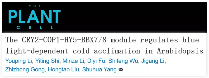 8月24日,中国农业大学杨淑华教授团队在The Plant Cell 杂志上在线发表了题为 The CRY2-COP1-HY5-BBX7/8 module regulates blue light-dependent cold acclimation in Arabidopsis的研究论文,揭示了拟南芥蓝光受体隐花色素CRY2 (cryptochrome) 调控植物冷锻炼的分子机制。该研究发现拟南芥蓝光受体组成的CRY2-COP1-HY5模块通过不依赖于CBF/DREB1的BBX7/8转录因子正调控一部分冷响应基因 (COR 基因),从而正调控植物的抗冻性。