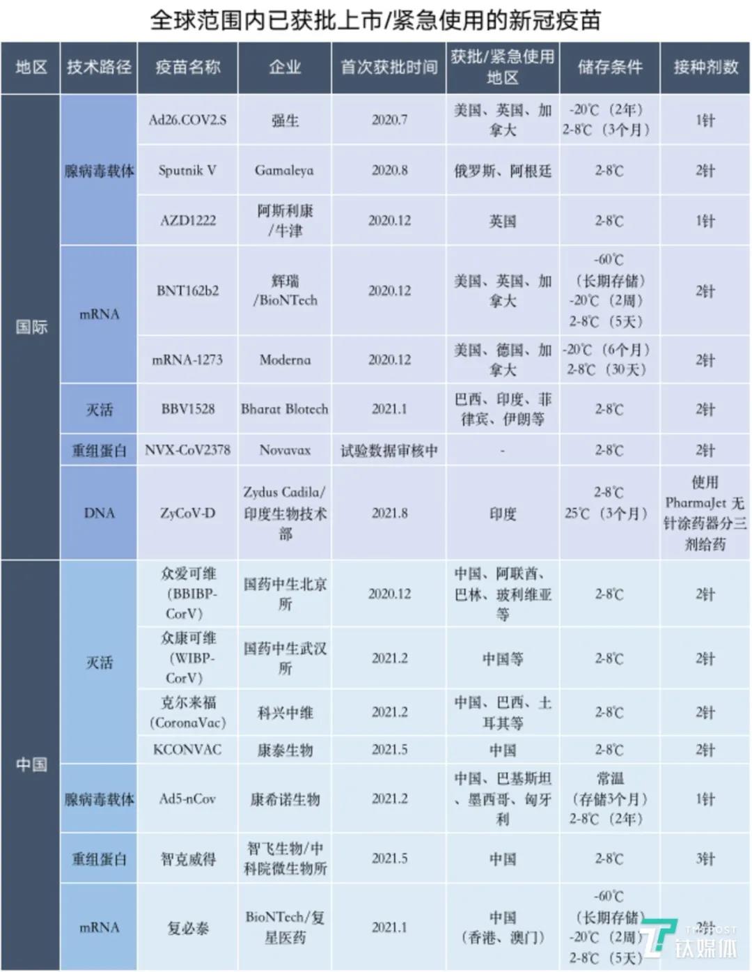 国药、科兴的灭活疫苗先行一步获批,康希诺生物的腺病毒载体疫苗后来居上,康泰生物的灭活疫苗、智飞生物的重组蛋白疫苗也在今年被授权紧急使用。国内至今还未有mRNA疫苗获批。