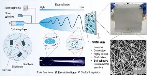 凌盛杰课题组以天然丝蛋白与石墨烯为原材料,通过高效的气流辅助静电纺丝方式制备了由丝蛋白纳米纤维离子导体和石墨烯片共同构成的多级结构的电子皮肤。与一般静电纺丝方法显著不同的是,研究人员的方法受溶液导电性影响较小,可实现高盐离子含量聚合物的纺丝,且对纤维聚集体的结构具有较好的操控性,其纺丝效率通常可达到普通电纺丝的5~10倍。