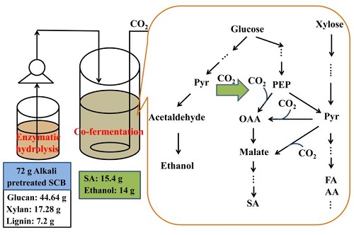 基于微生物合成琥珀酸和乙醇的特性,科研人员通过耦合优化产物精炼过程,实现了对木质纤维素生物质水解液中可发酵糖的充分利用。此外,将燃料醇生产过程中产生的二氧化碳加以利用,在减少碳损失的同时又生产出了琥珀酸产品,开辟了温室气体二氧化碳利用的新途径。
