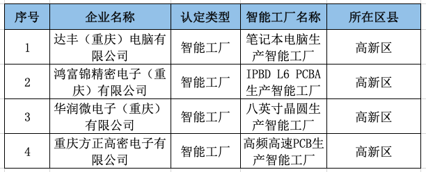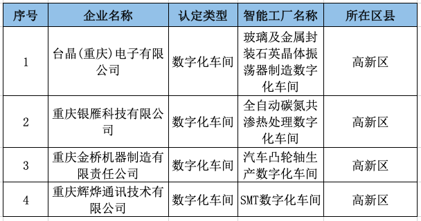 2020年重庆市数字化车间、智能工厂中