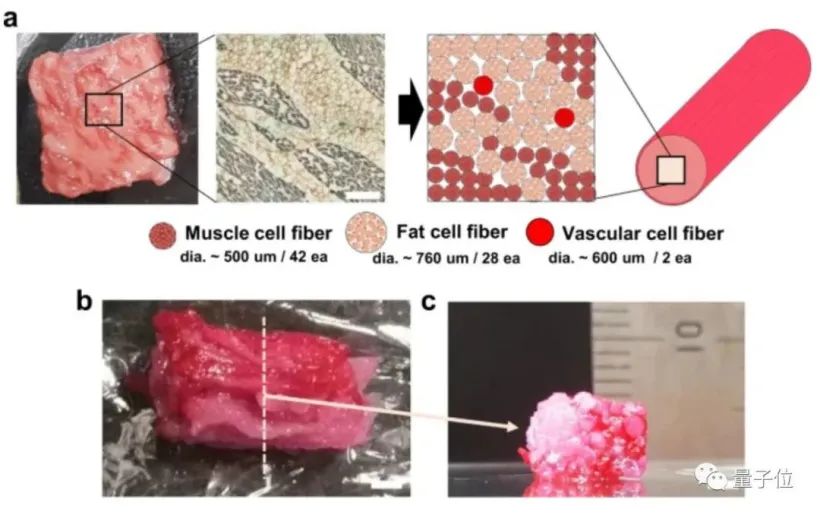 最终共构建了42块肌肉、28块脂肪组织和2条毛细血管组成的总共72根纤维,组装出直径为5毫米、长度为10毫米的类似牛排的肉。值得一提的是,他们借鉴日本金太郎糖果的制作方式。